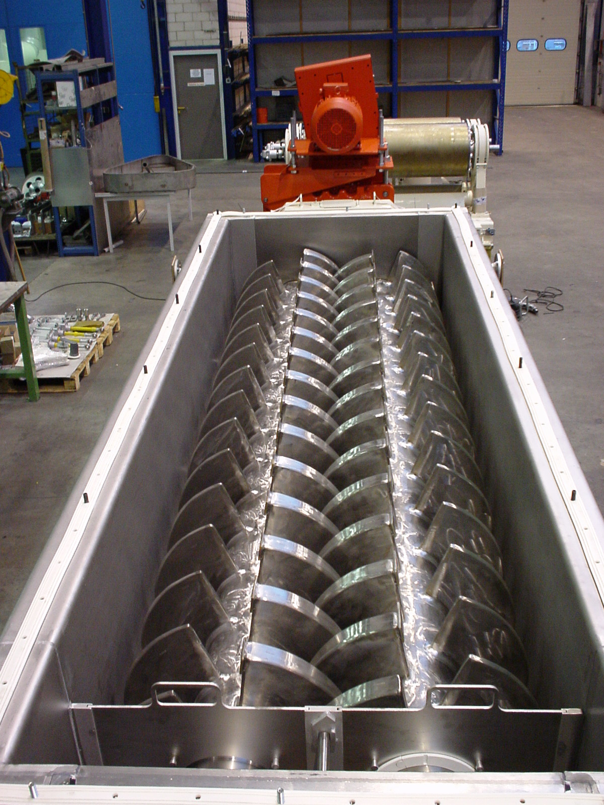 槳葉式干燥器是一種在設(shè)備內(nèi)部設(shè)置攪拌槳,使?jié)裎锟圃跇~的攪動(dòng)下,與熱載體以及熱表面充分接觸,從而達(dá)到干燥目的的低速攪拌干燥器。結(jié)構(gòu)形式一般為臥式,雙軸或四軸。槳葉式干燥器分為熱風(fēng)式和傳導(dǎo)式。熱風(fēng)式即通過(guò)熱載體(如熱空氣)與被干燥的物料相互接觸并進(jìn)行干燥,在傳導(dǎo)式中熱載體并不與被干燥的物料直接接觸,而是熱表面與物料相互接觸。傳導(dǎo)式的優(yōu)點(diǎn)是物料不易被污染,排氣量小,熱效率高,體積相對(duì)小,有利于節(jié)約能源及防止空氣污染。